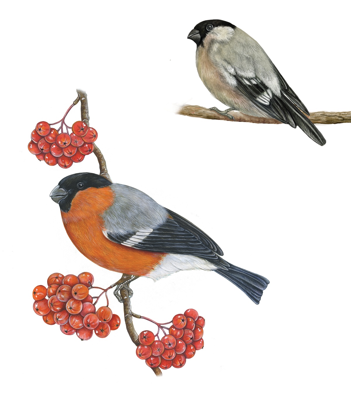Maschio di Ciuffolotto su ramo di Sorbo degli uccellatori con frutti. In alto femmina.